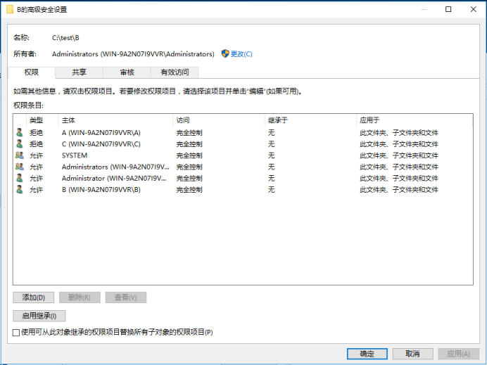 B文件夹设置用户B权限允许完全控制,A,C拒绝完全控制;