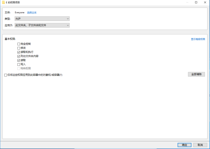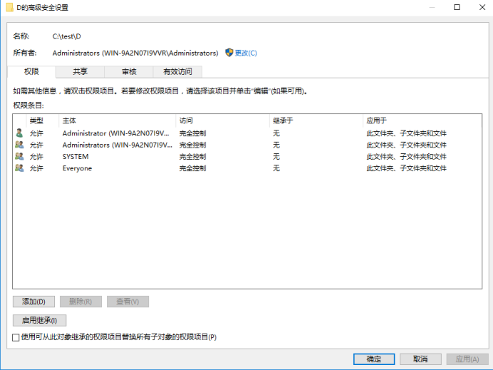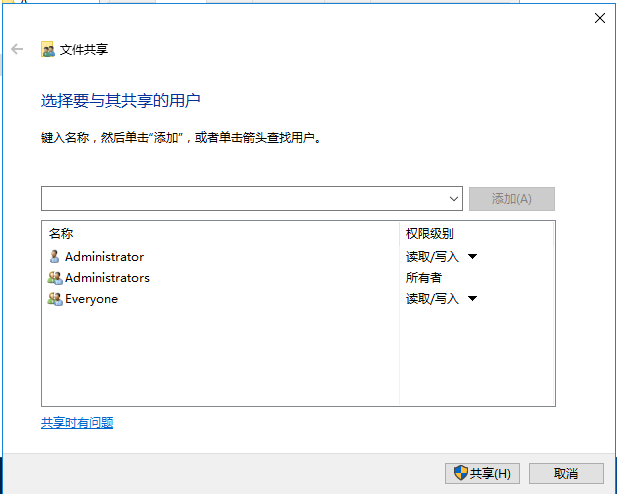 D文件夹在共享中选择Everyone,权限为读取/写入;
