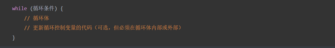 while 循环用于在给定条件为真(true)时重复执行一段代码。与for循环不同,while循环在循环开始前不初始化循环控制变量,而是在循环体内部或外部进行更新。while循环的语法结构如下: