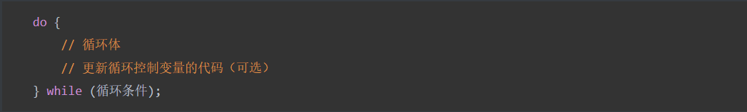 do-while 循环与while循环类似,但它在循环体至少执行一次之后才检查循环条件。这意味着,无论循环条件是否为真,do-while循环的循环体都会至少执行一次。do-while循环的语法结构如下:
