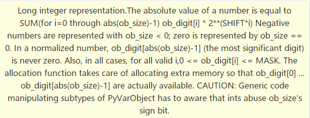 在这里,ob_digit 是使用了 C99 中的“柔性数组”来实现任意长度的整数的存储。这里我们可以看一下官方代码中的文档: