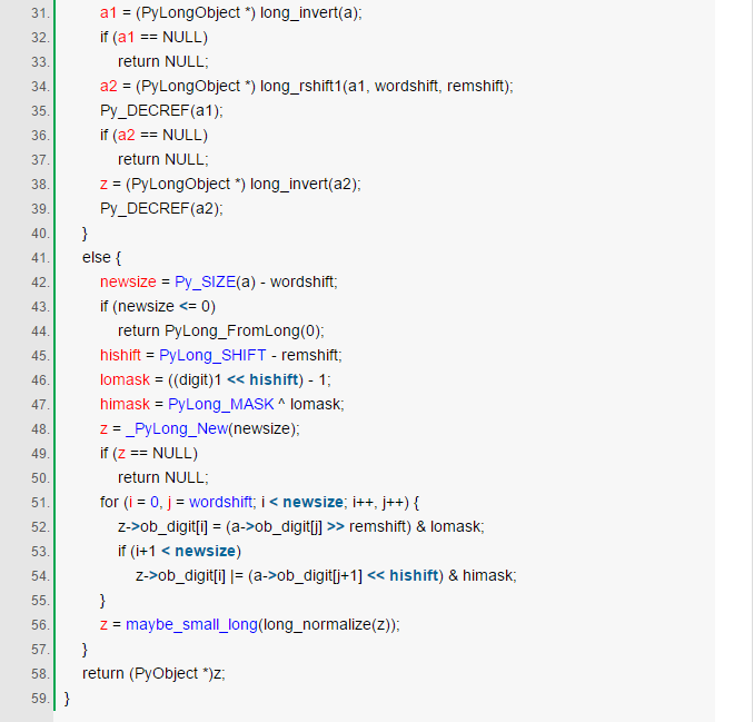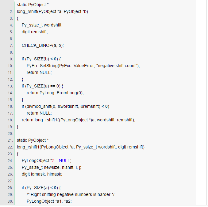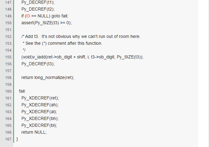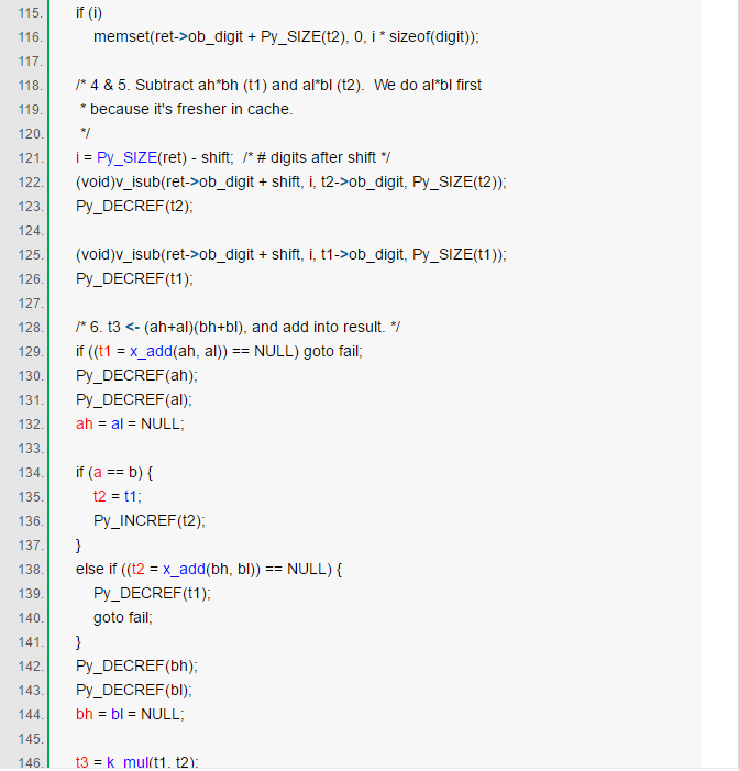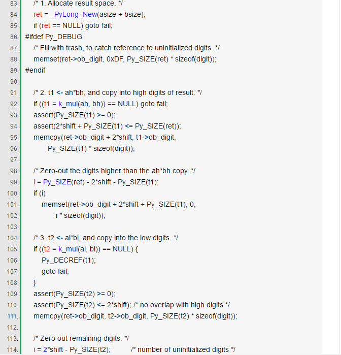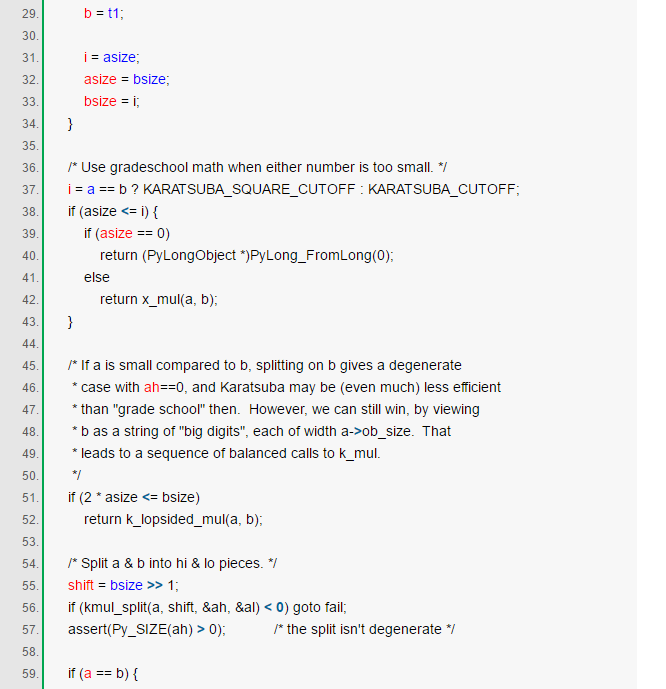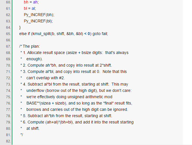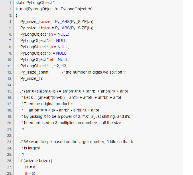 在这里我们看到,当两个数皆小于 2^30-1 时,Python 将直接使用普通乘法并返回,否则将使用 K 算法进行计算