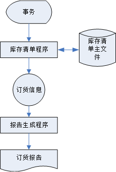 库中的CRT终端输入到计算机中;系统中的库存清单程序对事务进行处理,更新存储在磁盘上的库存清单主文件,并且把必要的订货