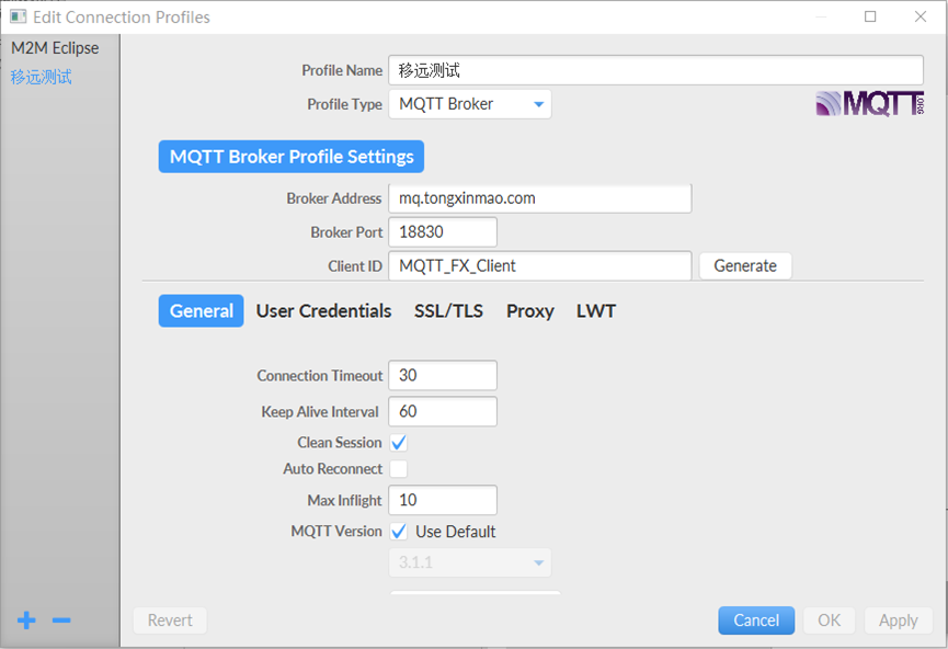 2. 设置服务器地址参数mq.tongxinmao.com,18830,MQTT_FX_Client