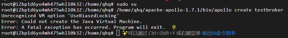 3. 执行 /home/qhq/apache-apollo-1.7.1/bin/apollo create testbroker , 创建一个broker实例,但是报错如下