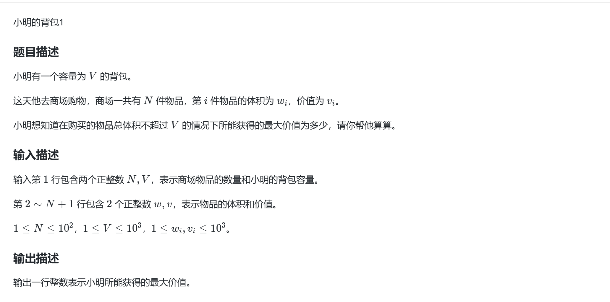 我们想要两者之见最优(即价值最大)的选法那么就要比较 选此物品前:背包剩余容量为j-w[i]的最大价值+第i件物品的价值v[i] 和 不选此物品价值:背包剩余为j的最大价值,我们取两者较大值作为选完此物品的最大价值。
