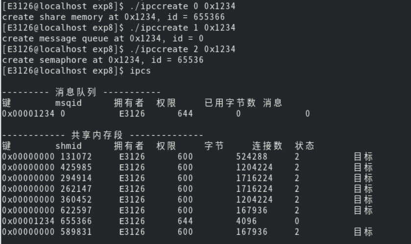 例题:程序 ipccreate 用于在指定的键值上创建 ipc 内核对象。使用格式为 ./ipccreate ,比如./ipccreate 0 0x8888 表示在键值 0x8888 上创建共享内存。