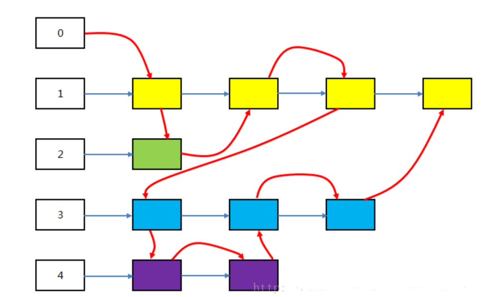 其中数字 1 表示类型为 1 的消息,数字2、3、4 类似。彩色块表示消息数据,它们被挂在对应类型的链表上。值得注意的是,刚刚说过没有消息类型为 0 的消息,实际上,消息类型为 0 的链表记录了所有消**息加入队列的顺序**,其中红色箭头表示消息加入的顺序。