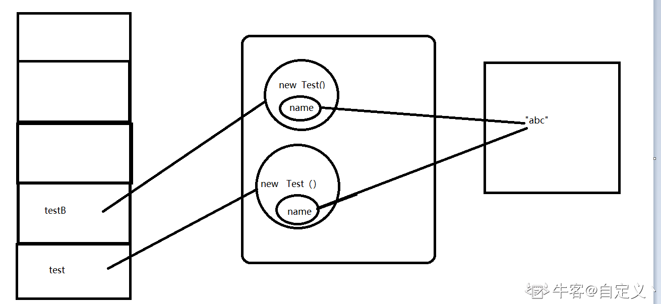 解释:ex作为对象引用保存在栈帧内的局部变量表内,指向在堆中的对象实例,而该对象内的成员str、ch分别指向堆中分配的另外两个对象实例(new String(“good”)、以及数组,数组和对象实例在堆中分配)