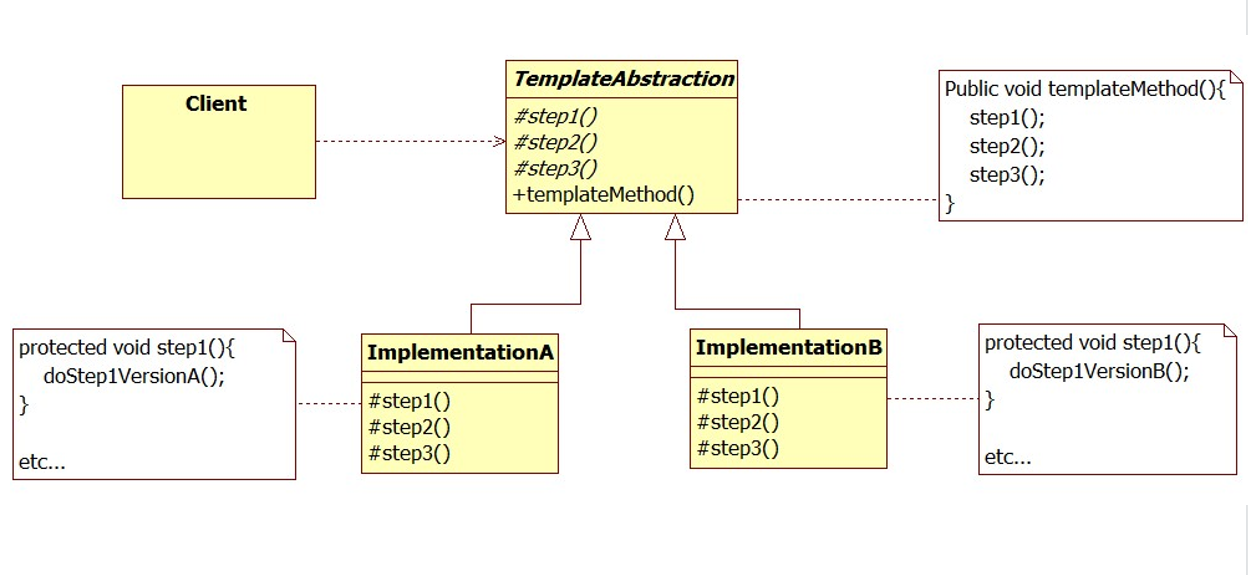 共性的操作步骤在抽象类中公共实现,差异化的步骤在各个子类中实现
