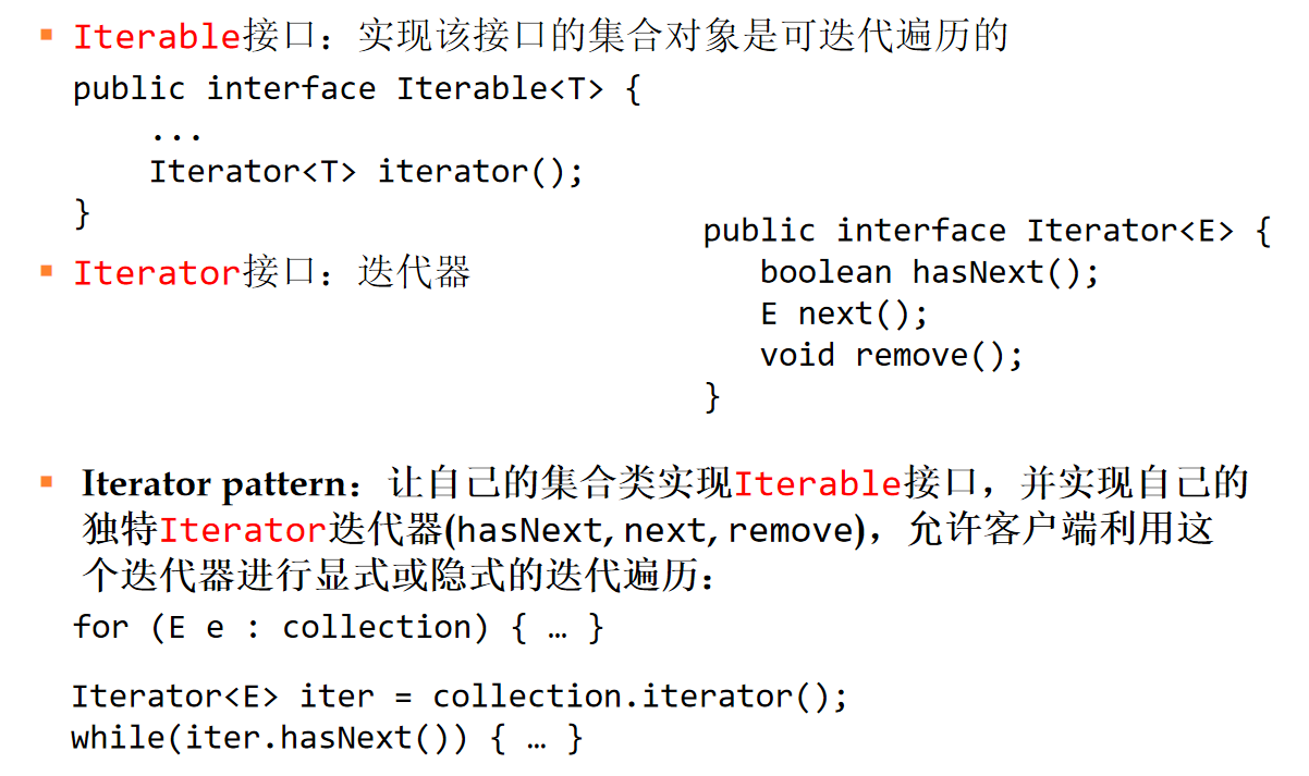 让自己的集合类实现 Iterable 接口,并实现自己的独特 Iterator 迭代器 (hasNext, next, remove) ,允许客户端利用这个迭代器进行显式或隐式的迭代遍历: