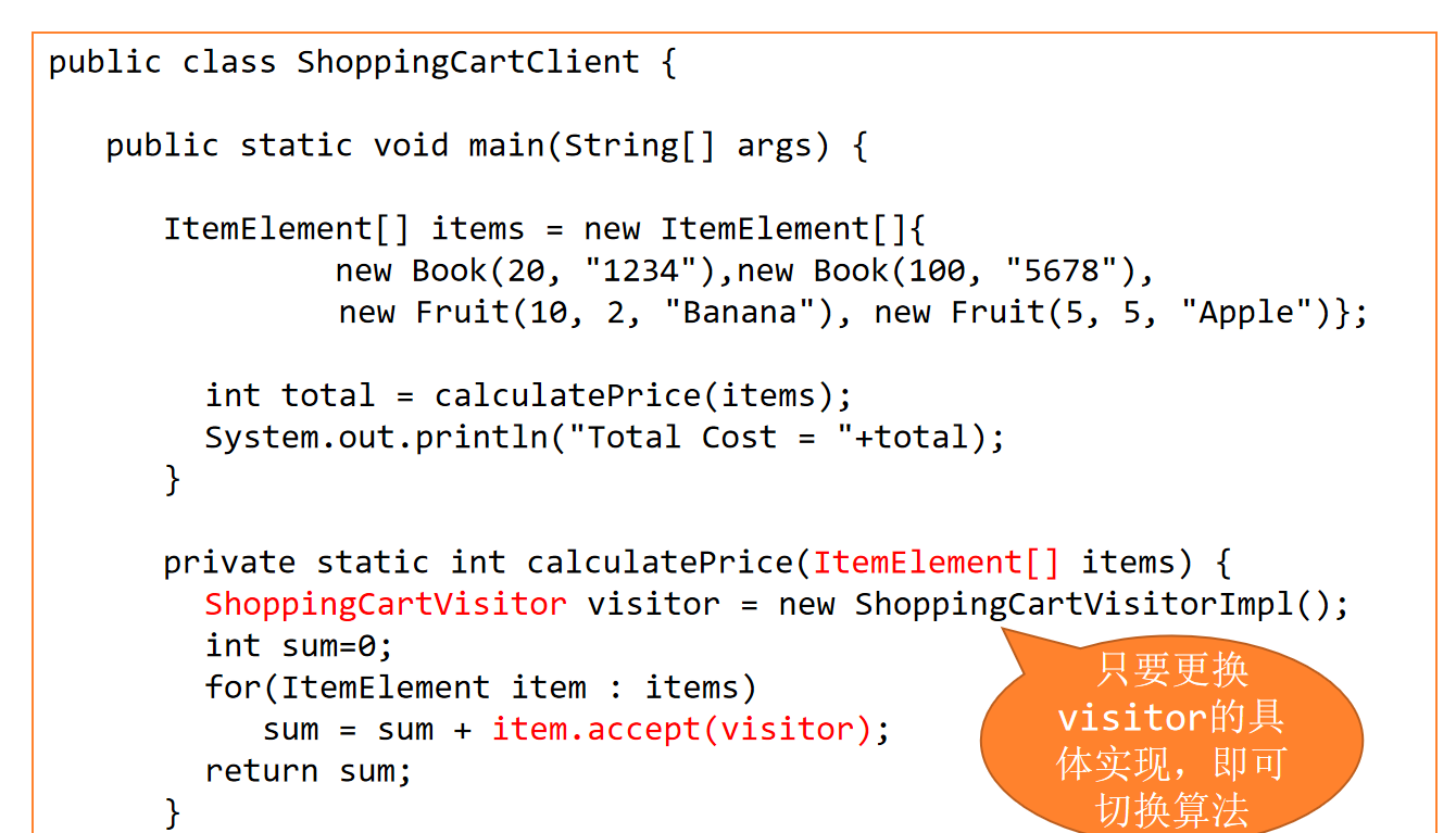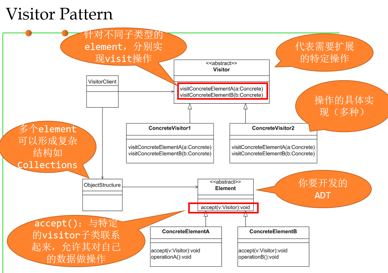 但是Visitor强调是的外部定义某种对ADT的操作,该操作于ADT自身关系不大(只是访问ADT),故ADT内部只需要开放accept(visitor)即可,client通过它设定visitor操作并在外部调用。