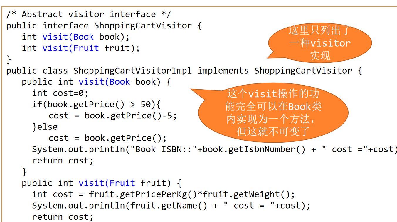 Visitor:在特定ADT上执行某种特定操作,但该操作不在ADT内部实现,而是delegate到独立的visitor对象,客户端可灵活扩展/改变visitor的操作算法,而不影响ADT