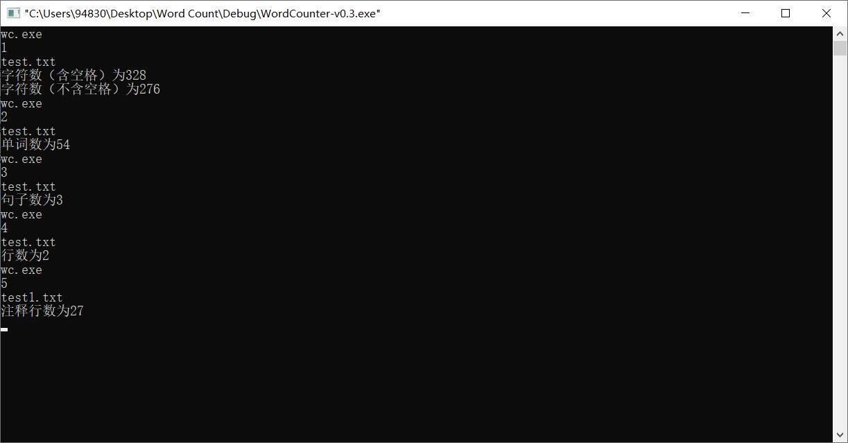 - v0.3.cpp为完成扩展功能源代码(字符数,单词数,句子数,行数)