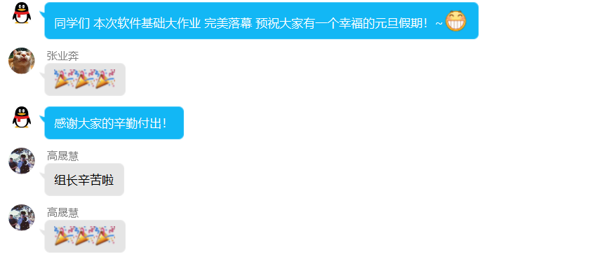 本次作业中,我们小组同学相互督促,分工合作,从简单的需求分析到最终的软件实现,我们通过合作的方式解决了许多困难,收获了许多。