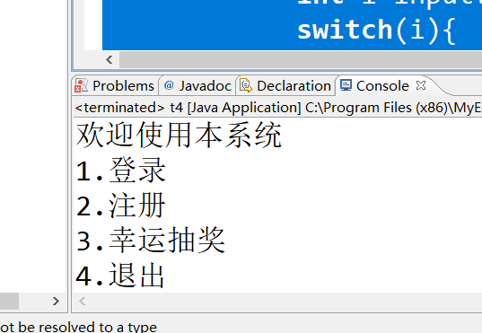 package sr5; import java.util.Scanner; public class t4 { public static void mainMenu(){ Scanner input=new Scanner(System.in); System.out.println("欢迎使用本系统"); System.out.println("1.登录"); System.out.println("2.注册"); System.out.println("3.幸运抽奖"); System.out.println("4.退出"); System.out.println("请选择"); int i=input.nextInt(); switch(i){ case 1: login(); break; case 2: reg(); break; case 3: lucky(); } } private static void lucky() { // 输入四位会员卡号,如果百位数等于随机数,幸运会员。否则不是。同时也要询问是否返回主菜单 Scanner input=new Scanner(System.in); System.out.println("请输入一个四位数"); int a=input.nextInt(); Random r=new Random(); int x=r.nextInt(10); int baiwei=a%1000/100; while(a<1000||a>10000){ System.out.println("输入错误,请重新输入"); a=input.nextInt(); if(a>=1000&&a<10000){ break; } } if(baiwei==x){ System.out.println("幸运会员"); }else{ System.out.println("不是幸运会员"); } returnMain(); } public static void returnMain(){ Scanner input=new Scanner(System.in); System.out.println("是否返回主菜单?"); if(input.next().equalsIgnoreCase("Y")) mainMenu(); else System.out.println("谢谢使用"); } public static void reg() { // TODO Auto-generated method stub Scanner input=new Scanner(System.in); System.out.println("输入要注册的用户名"); String uname=input.next(); System.out.println("输入注册密码"); String upwd=input.next(); System.out.println("注册成功"); returnMain(); } public static void login(){ Scanner input=new Scanner(System.in); System.out.println("输入用户名"); String uname=input.next(); System.out.println("输入密码"); String upwd=input.next(); if(uname.equals("zs")&&upwd.equals("123")){ System.out.println("ok"); }else{ System.out.println("fail"); } returnMain(); } public static void main(String[] args) { mainMenu(); } }