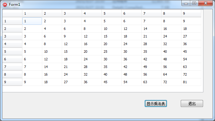 procedure TForm1.BitBtn1Click(Sender: TObject); var i,j:Integer; begin for i := 1 to 9 do for j := 1 to 9 do StringGrid1.Cells[i,j]:=IntToStr(i*j); end; procedure TForm1.BitBtn2Click(Sender: TObject); begin Close; end; procedure TForm1.FormCreate(Sender: TObject); var i:Integer; begin for i := 1 to 9 do begin StringGrid1.Cells[0, i] := IntToStr(i); StringGrid1.Cells[i, 0] := IntToStr(i); end; end;