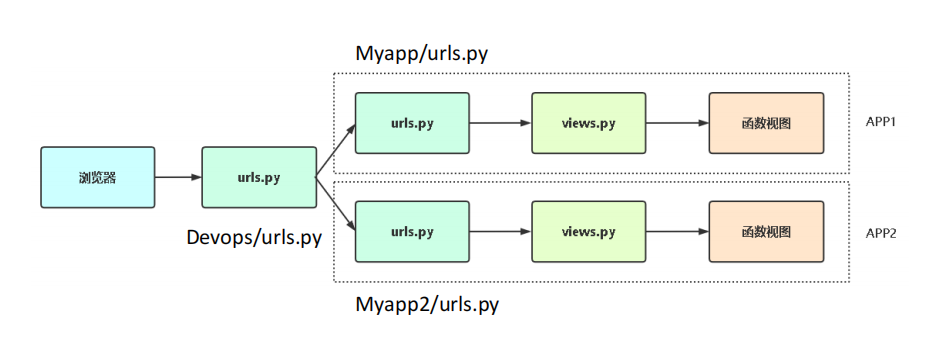 主目录中的urls.py是路径匹配的入口,它定义在 settings.py 中 ROOT_URLCONF = 'devops.urls' 约定,称主目录中的路由配置文件urls.py为 主路由 或 一级路由