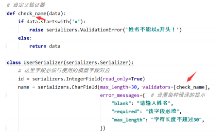 - 在序列化类外面定义验证器,使用validators参数指定验证器。