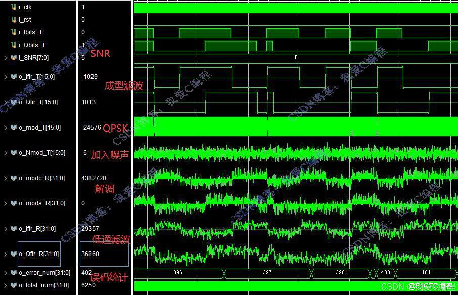 基于FPGA的QPSK调制解调系统,包含testbench,高斯信道模块,误码率统计模块,可以设置不同SNR