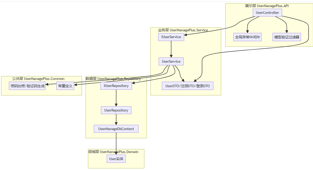 UserManagePlus.Service 依赖 UserManagePlus.Repository 和 UserManagePlus.Domain