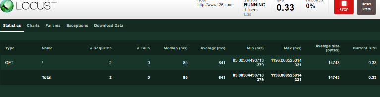 不同与jmeter复杂的用户使用界面,locust的界面干净整洁,可以实时显示测试的相关细节(如发送请求数、失败数和当前发送请求速度等);