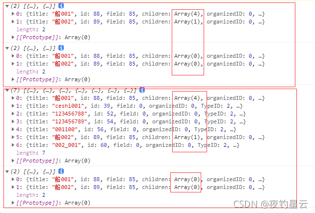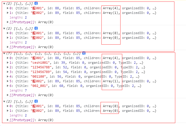 上面两个数组是没有拉伸的原始树形结构数组数据,下面的两个数组是已经拉伸成一维数组的数据,两个一维数组比对起来是不是方便许多