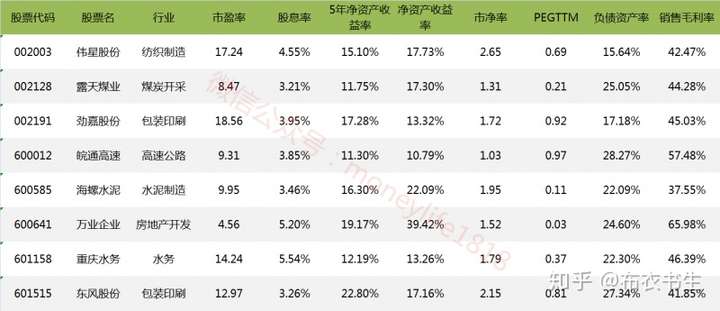 今天也用财务指标对市场上所有的股票进行了筛选,得出了下面8只股票。主要是看的市盈率、股息率、净资产收益率、市净率、PEG、资产负债率、毛利率。