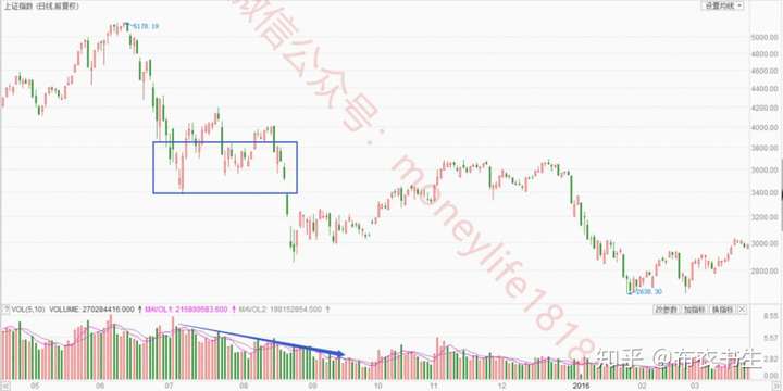 人们还抱着黄金十年的幻想,下跌的初期成交量依旧很大,毕竟比顶部更便宜了,此时人们都相信这仅仅是回调。