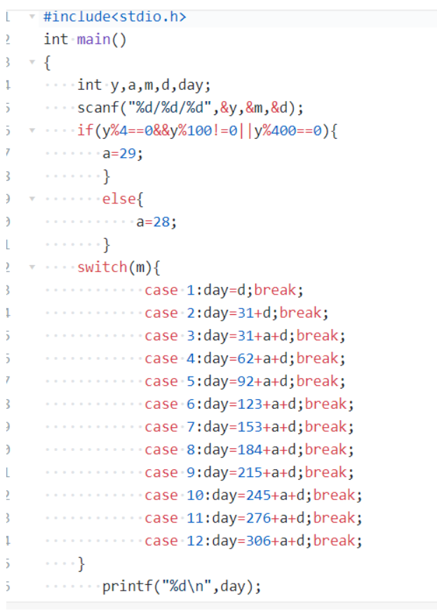 数据处理:if-else语句的嵌套的运用。首先先区分闰年和非闰年的2月天数。如果天数大于等于3就正常减2。如果天数小于等于2且月份为3,就要根据是否为闰年来判断。如果月份为1月且天数小于等于2,这年份要减1,月份要变成12,再计算天数。