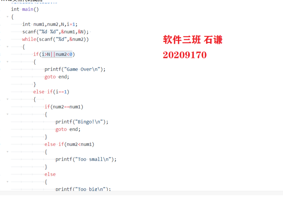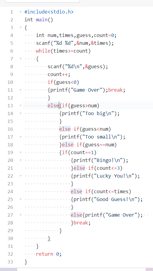 数据处理:while循环语句和if-else语句的运用。用while(times>=count)先搞出循环,再分情况讨论猜数大小和要猜数的大小的比较以及猜的次数和给定最大可以猜的次数比较:if(guess<0) if(guess>num)if(guess<num) if(guess==num) if(count==1) if(count<=3) if(count<=times)