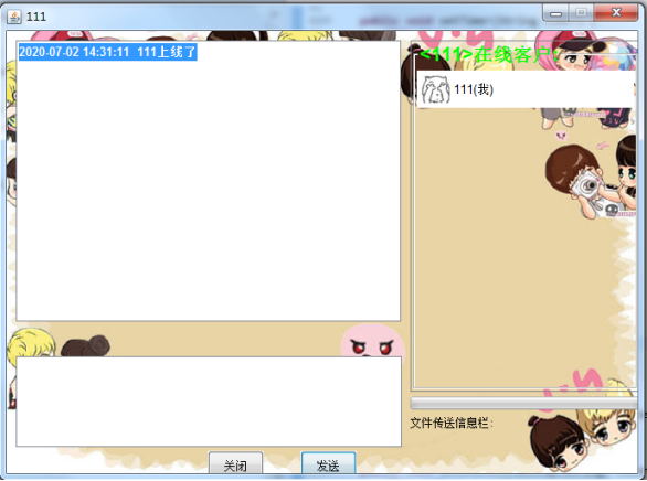 用户输入的用户名和密码都正确后,则进入聊天室。聊天主界面:公聊的聊天信息、在线用户列表、好友列表,系统消息和聊天的一些操作。