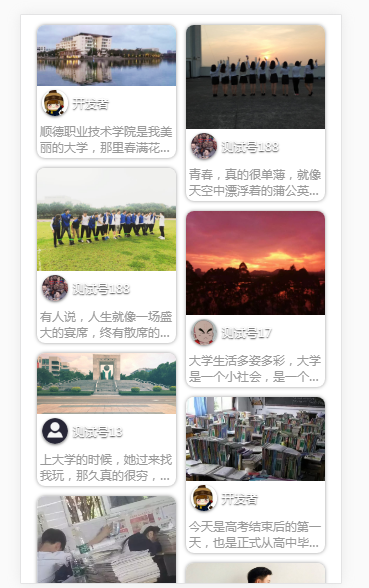 <!DOCTYPE html> <html lang="en"> <head> <meta charset="UTF-8"> <meta name="viewport" content="width=device-width, initial-scale=1.0, maximum-scale=1.0, user-scalable=0,minimum-scale=1.0"> <title>瀑布流布局</title> <script type="text/javascript" src="http://www.xxiaoyuan.top/jquery-1.9.1.js"></script> <style> [v-cloak]{ display: none!important; } *{ padding: 0; margin: 0; list-style-type: none; } body{ width: 95%; margin: 10px auto; } .pubu{ width: calc(100% - 16px); margin-left: 8px; } .yg img{ width:100%; border-radius: 8px 8px 0 0; } .yg p{ width: 100%; font-size: 0.75rem; padding:3px; overflow: hidden; text-overflow:ellipsis; white-space: nowrap; text-overflow: ellipsis; display: -webkit-box; -webkit-line-clamp: 2; -webkit-box-orient: vertical; overflow: hidden; color: #999; } .yg_l , .yg_r{ width: calc(50% - 5px); } .yg li{ background: #fff; border-radius: 8px; margin-bottom: 10px; box-shadow: 0 0 5px #999; } .yg_l{ float: left; } .yg_r{ float: right; } .u_xinx{ position: absolute; bottom: 4px; } .u_xinx img{ margin-left: 5px; background: rgba(0,0,0,.2); box-shadow: 0 1px 3px rgba(0,0,0,.5); width: 26px; height: 26px; border-radius: 50%; display: inline-block; } .u_xinx span{ position: relative; text-shadow: 0 1px 1px #333; top: -8px; color: #fff; font-size: 0.6rem; } </style> </head> <body> <div id="vm" class="pubu" v-cloak> <ul id="show" class="yg yg_l"> <li v-for="(item,index) in showwz" v-if="index%2==0"> <div style="position: relative;"> <img :src="item.e_img" alt=""> <div class="u_xinx"> <img :src="item.u_img" alt=""> <span>{{item.u_name}}</span> </div> </div> <p>{{item.e_intro}}</p> </li> </ul> <ul class="yg yg_r"> <li v-for="(item,index) in showwz" v-if="index%2==1" > <div style="position: relative;"> <img :src="item.e_img" alt=""> <div class="u_xinx"> <img :src="item.u_img" alt=""> <span>{{item.u_name}}</span> </div> </div> <p>{{item.e_intro}}</p> </li> </ul> <div style="clear: both;"></div> </div> </body> <script type="text/javascript" src="http://www.xxiaoyuan.top/vue.js"></script> <script type="text/javascript"> var vm = new Vue({ el:"#vm", data:{ showwz:[], wznum:'' }, methods:{ getwz:function(){ var that = this; $.ajax({ url:"http://xxiaoyuan.top/controller/wz/wz.php", type:"POST", dataType:"json", data:{ u_id:512, }, success:function(res){ console.log(res); that.showwz = res.data; that.wznum = res.data.length; } }); } }, mounted:function(){ this.getwz(); } }); </script> </html>