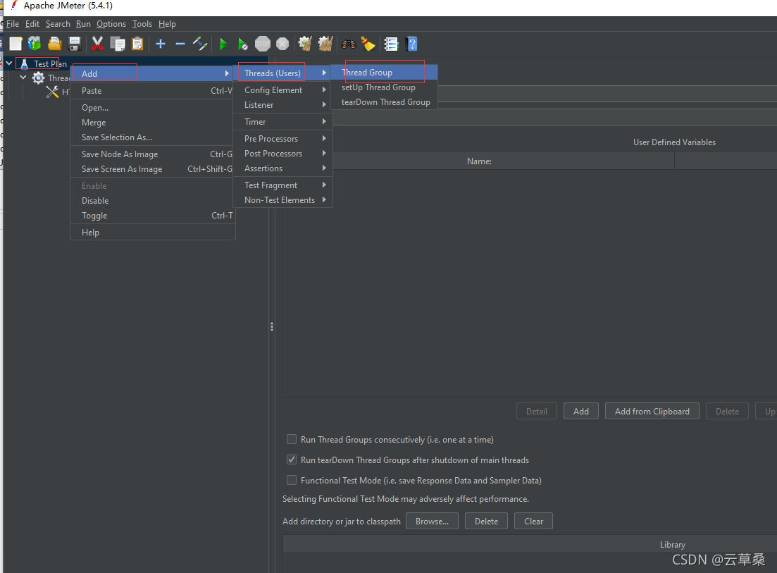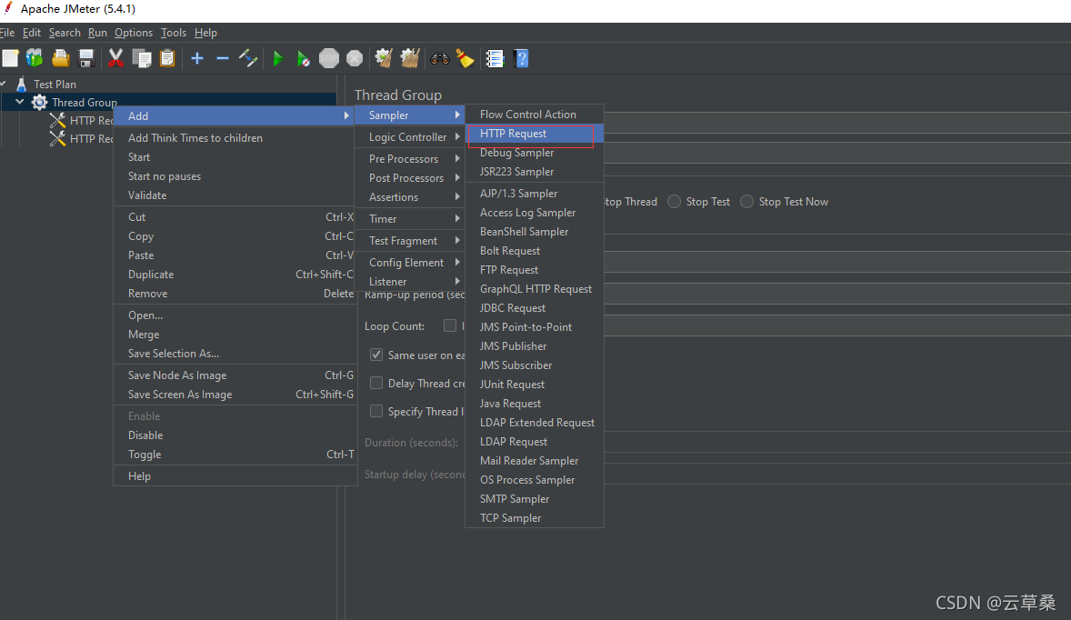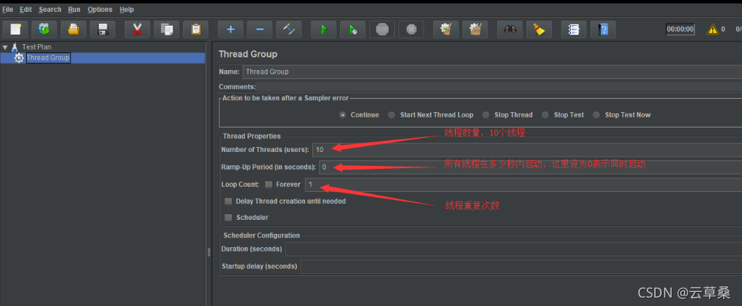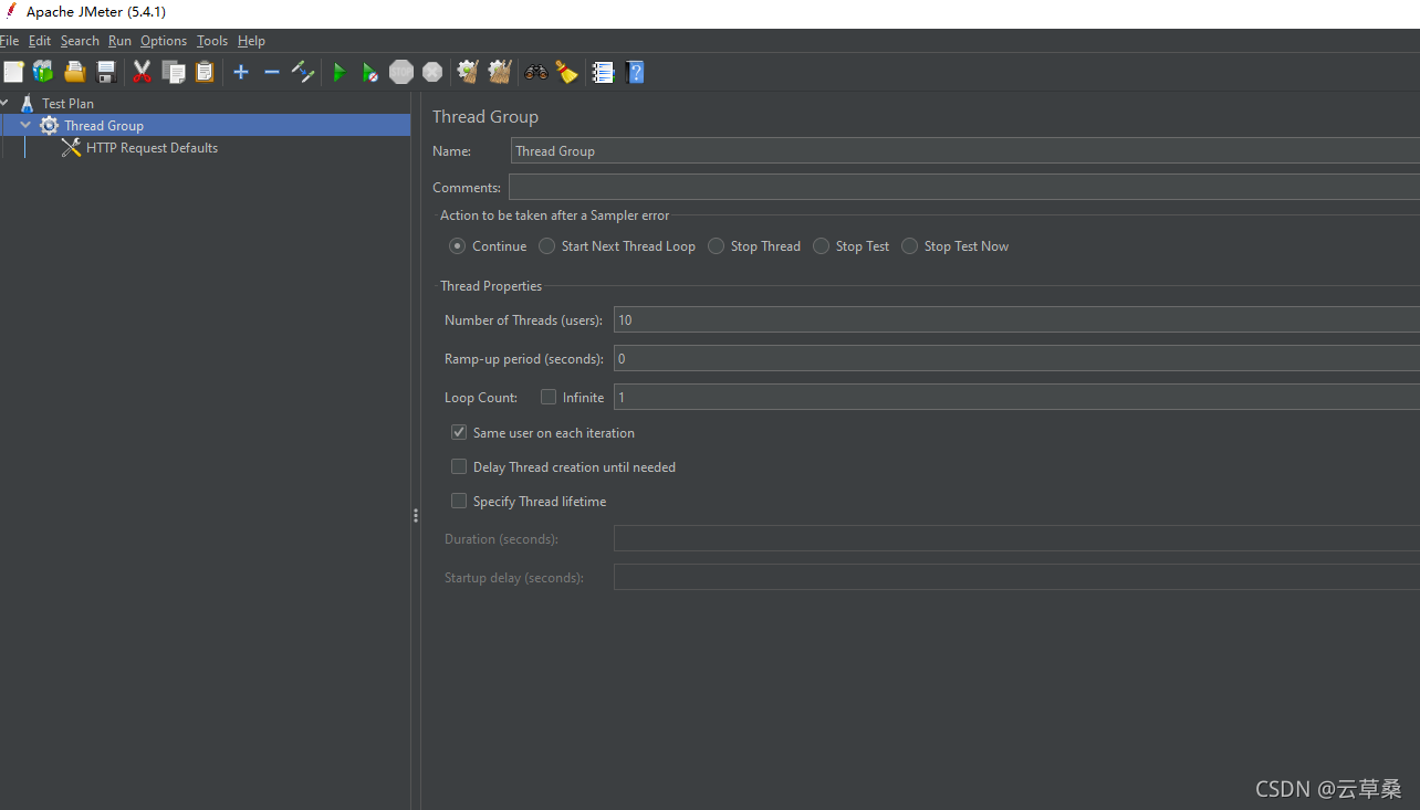 b. 设置线程组参数。这里配置为:10个线程,同时启动,循环一次。
