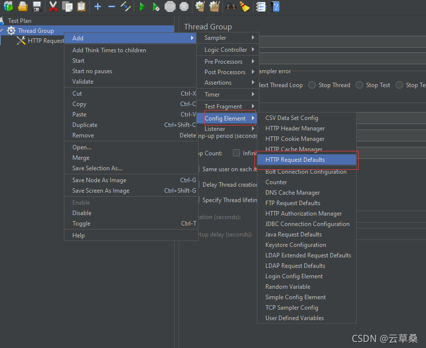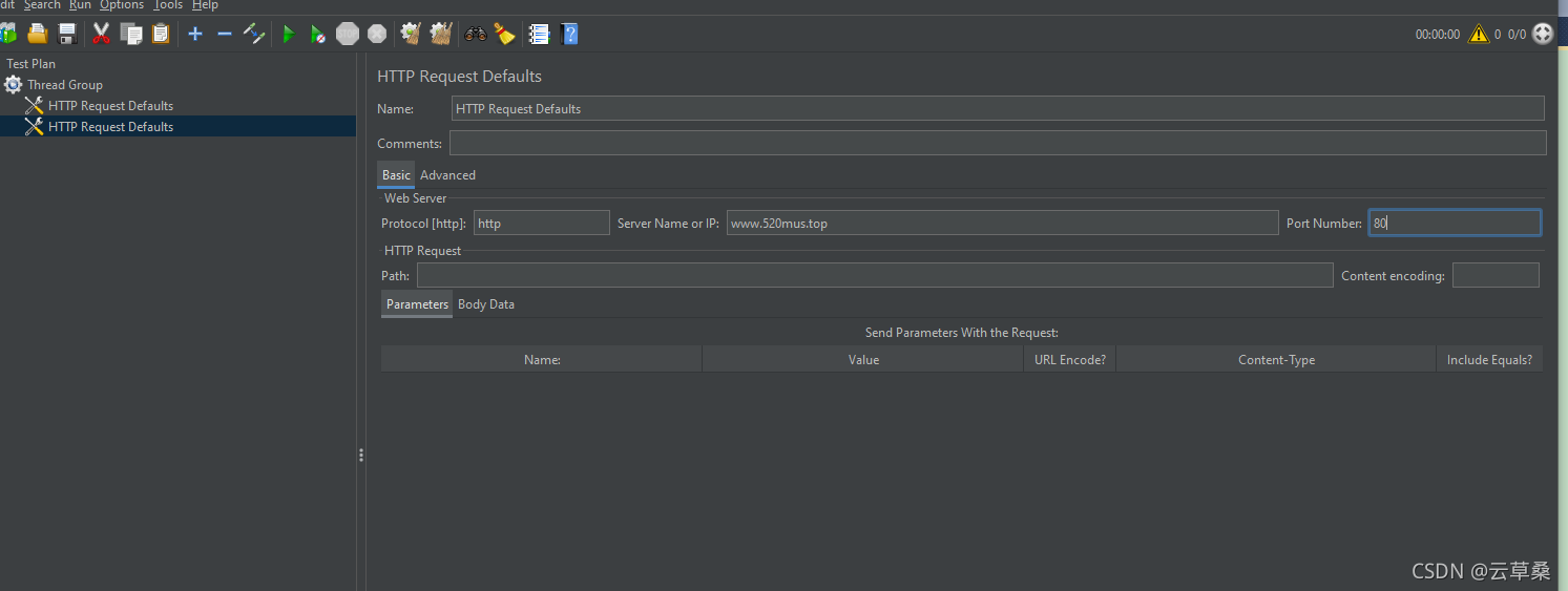 c. 新增http请求默认值。 在上一步创建的线程组上,新增http请求默认值,所有的请求都会使用设置的默认值,这设置协议为http,IP为www.520mus.top,端口为80。