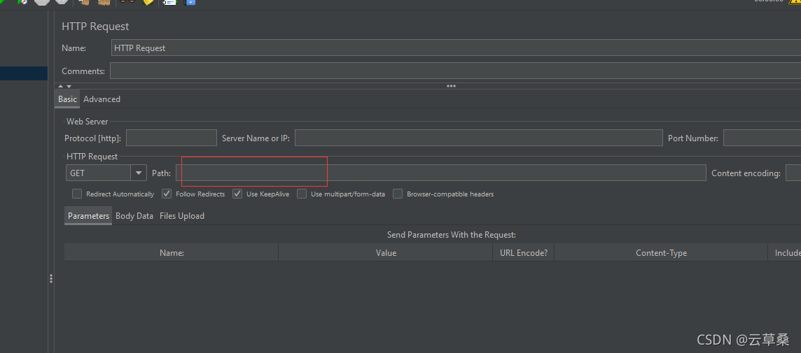 下图第一个红框内的协议、IP、端口不需要设置,会使用步骤c中设置的默认值,只需设置请求路径Path即可,这里填入。