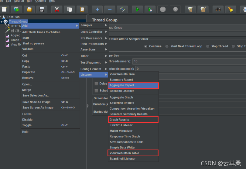 e. 新增监听器,用于查看压测结果。这里添加三种:聚合报告、图形结果、用表格查看结果,区别在于结果展现形式不同。