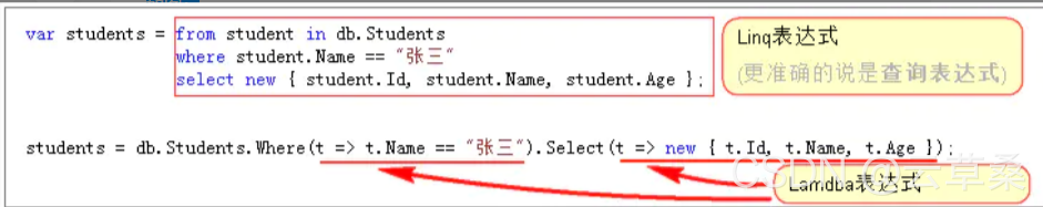 由此可见Linq表达式和Lambda表达式并没有什么可比性。