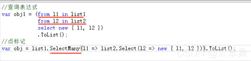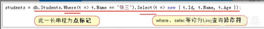 为什么?因为查询表达式在编译后就直接变成了点标记:(以下是上面两个语句对应的编译后的反编译C#代码)