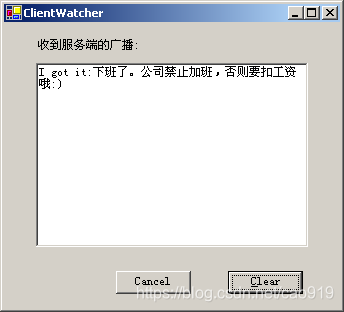 怎么样,很酷吧!你也可以同时打开多个客户端,它们都将收到这个广播信息。如果你觉得这个广播声音太吵,那就请你在客户端取消广播吧。在Cancle按钮中: