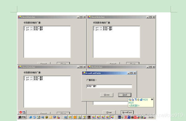 我们来试验一下。首先打开服务端,然后同时打开三个客户端。广播消息: