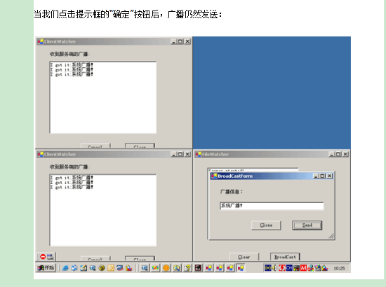 特殊的情况是,我们可以用第三种情况来代替第二种。只要你把发送信息的客户端放到服务端就可以了。当然需要做一些额外的工作,有兴趣的朋友可以去实现一下。在我的示例程序中,已经用这种方法模拟实现了服务端的广播,大家可以去看看。