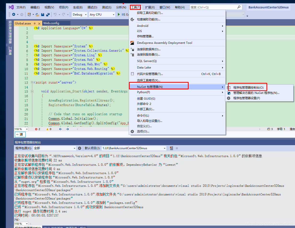 VisualStudio 打开项目 打开工具 -> NuGet包管理器 -> 程序包管理控制台