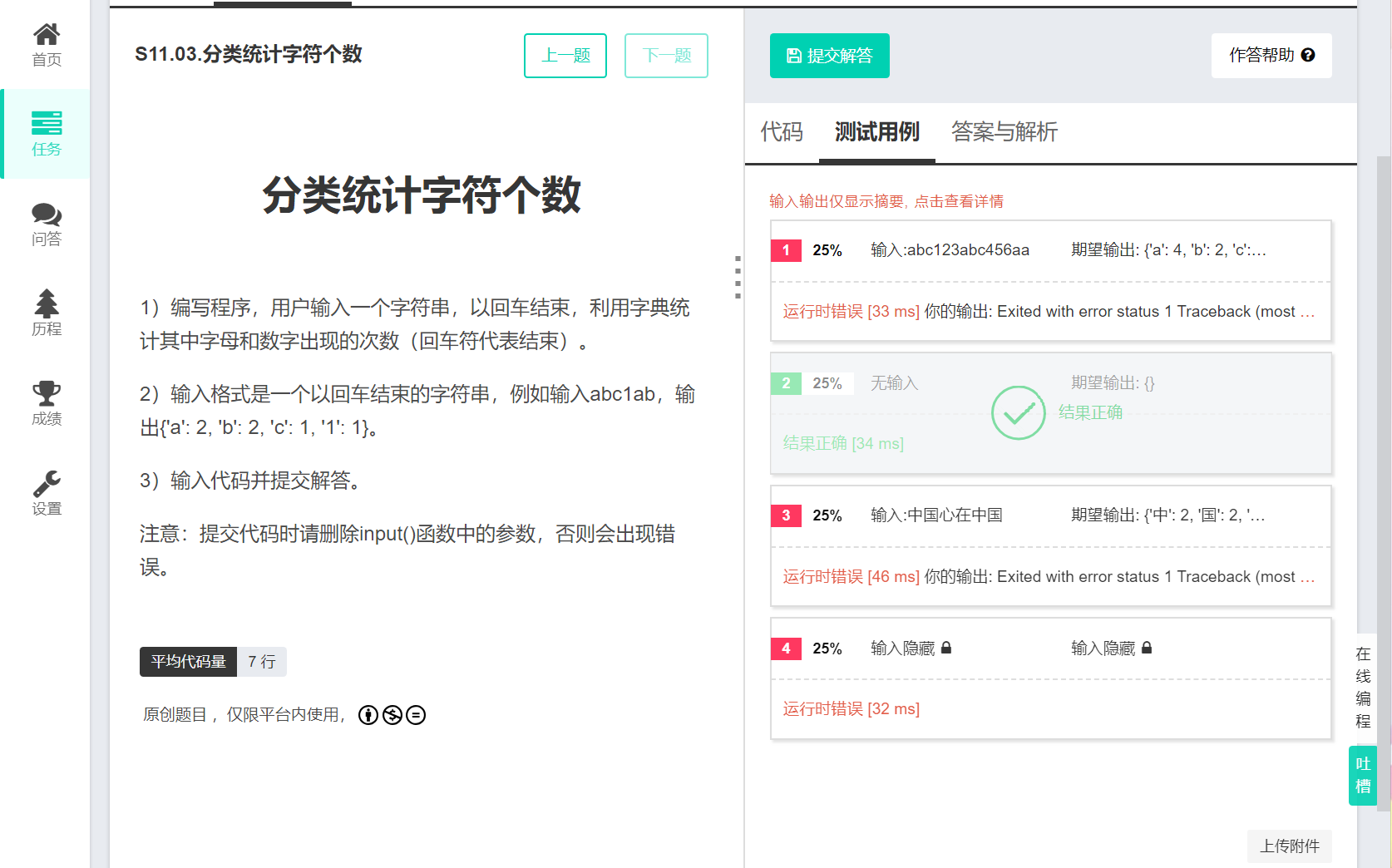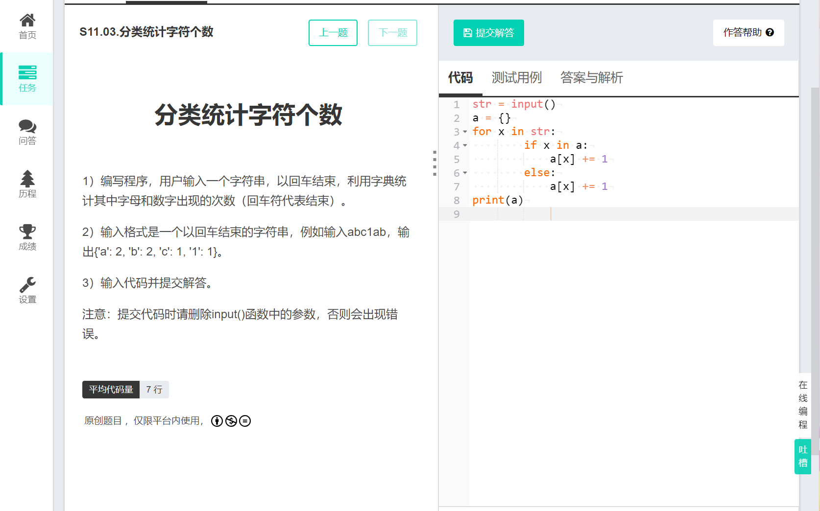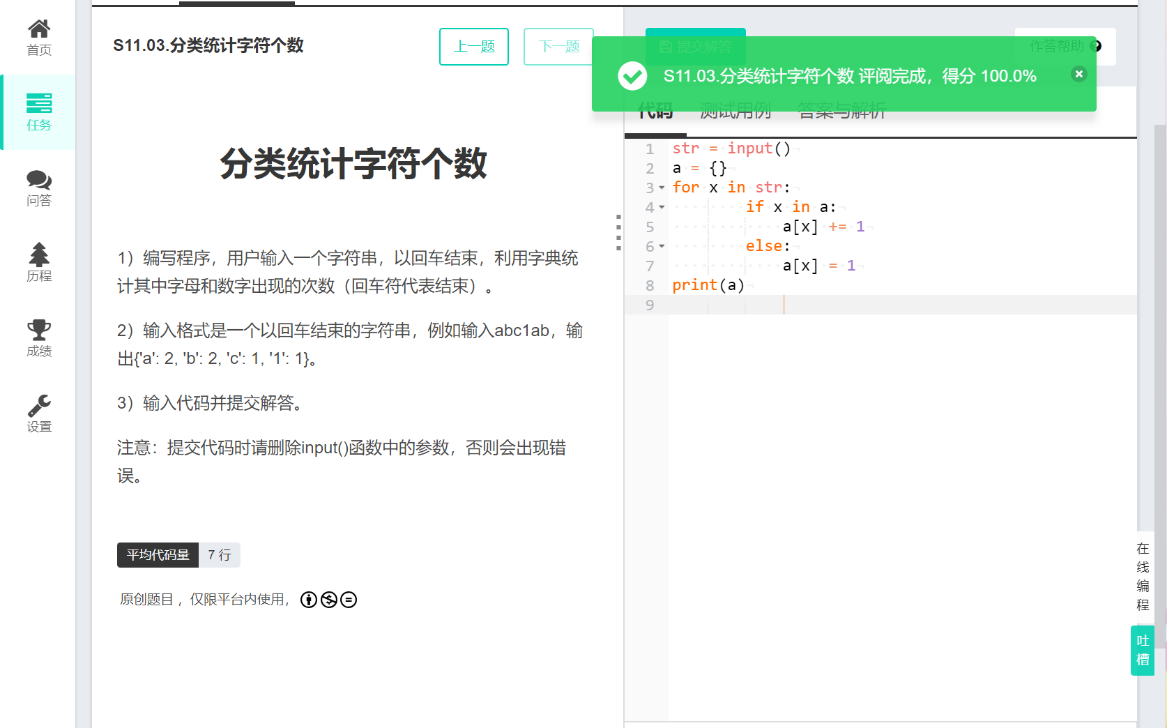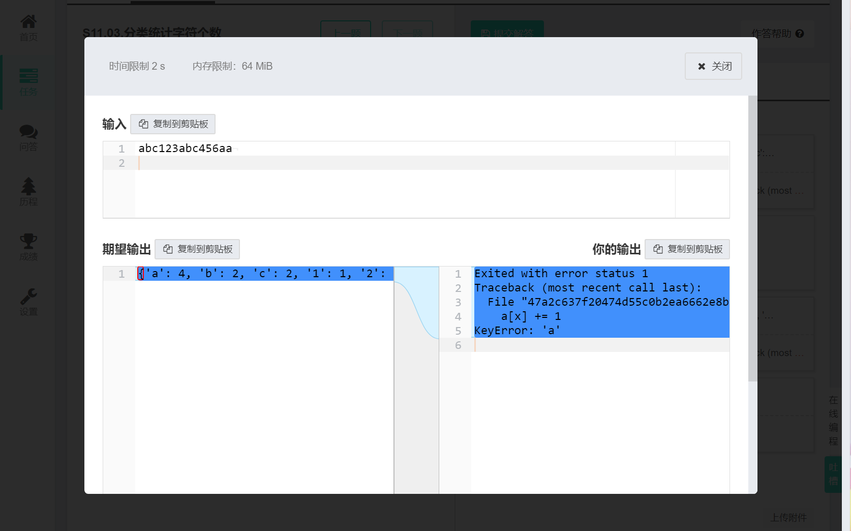 2)输入格式是一个以回车结束的字符串,例如输入abc1ab,输出{'a': 2, 'b': 2, 'c': 1, '1': 1}。