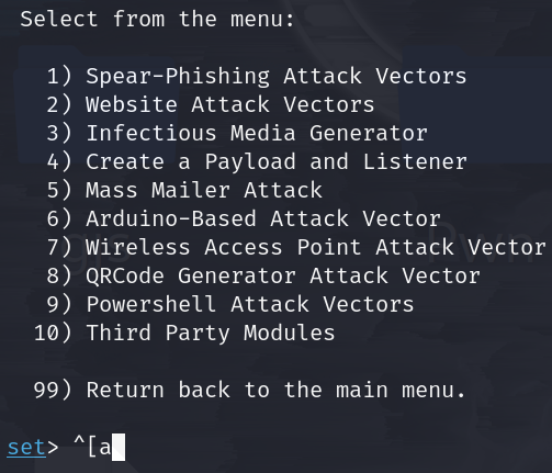 - Return to Webattack Menu(返回Web攻击菜单): 这个选项允许用户返回到 SET 的 Web 攻击主菜单,以便选择其他攻击方法或功能。