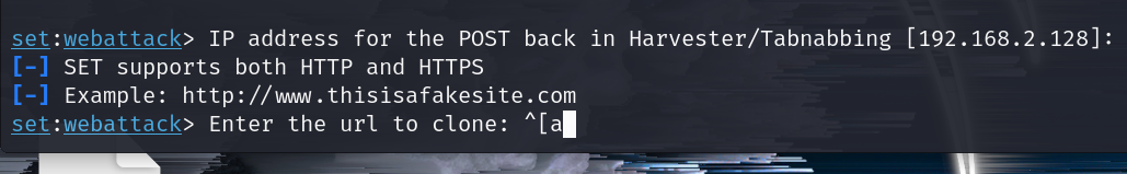 在已有的IP address for the POST back in Harvester/Tabnabbing [192.168.2.128]:一栏后输入回车,表示使用默认IP作为攻击机IP。