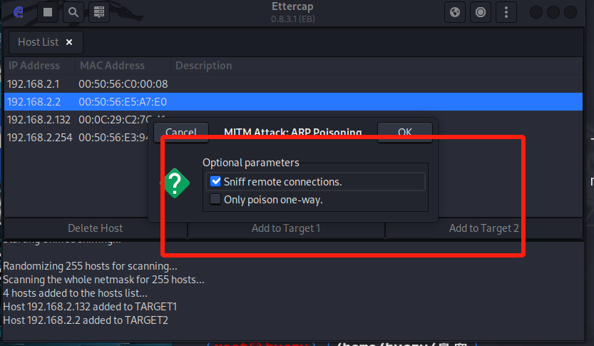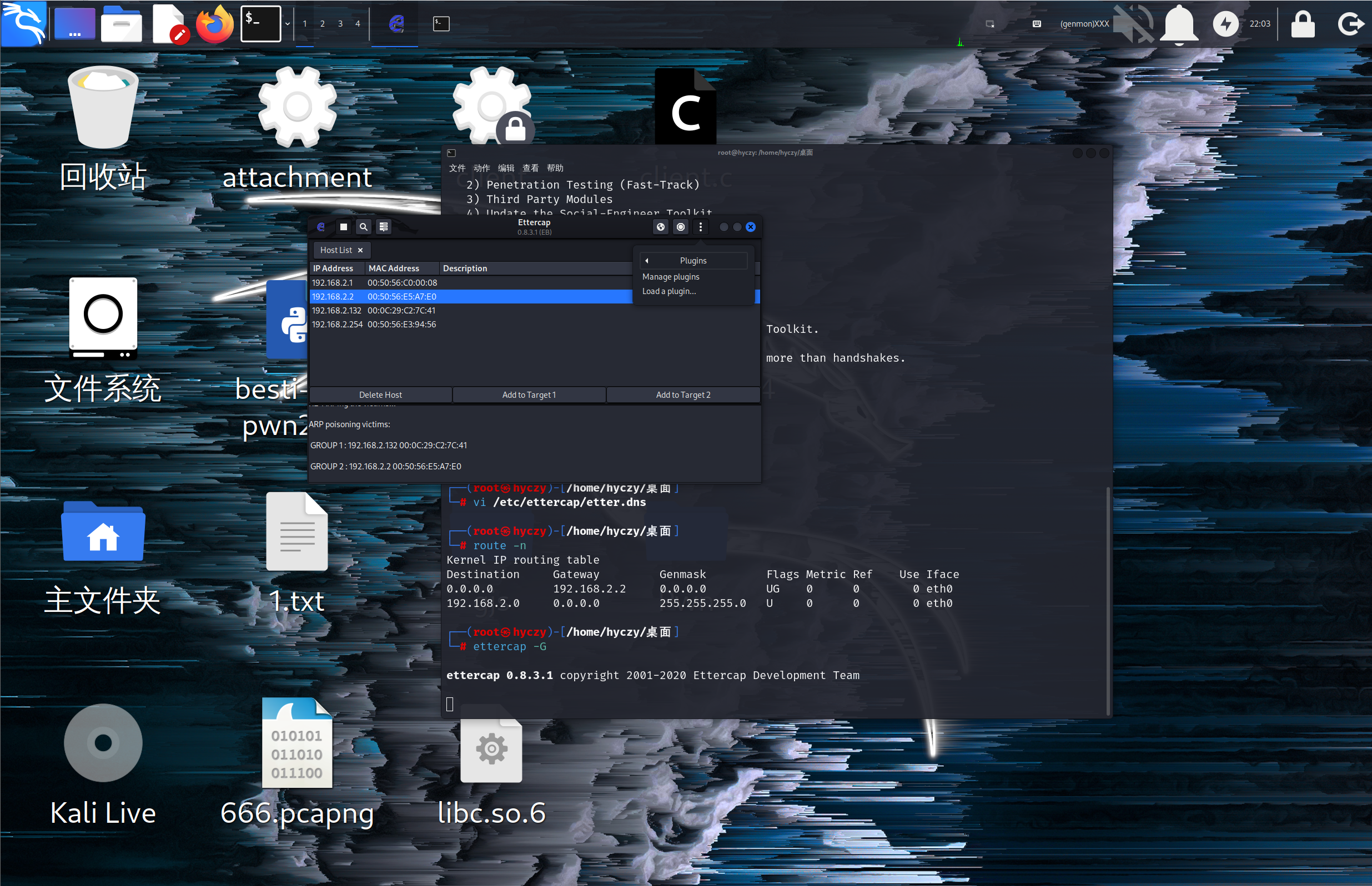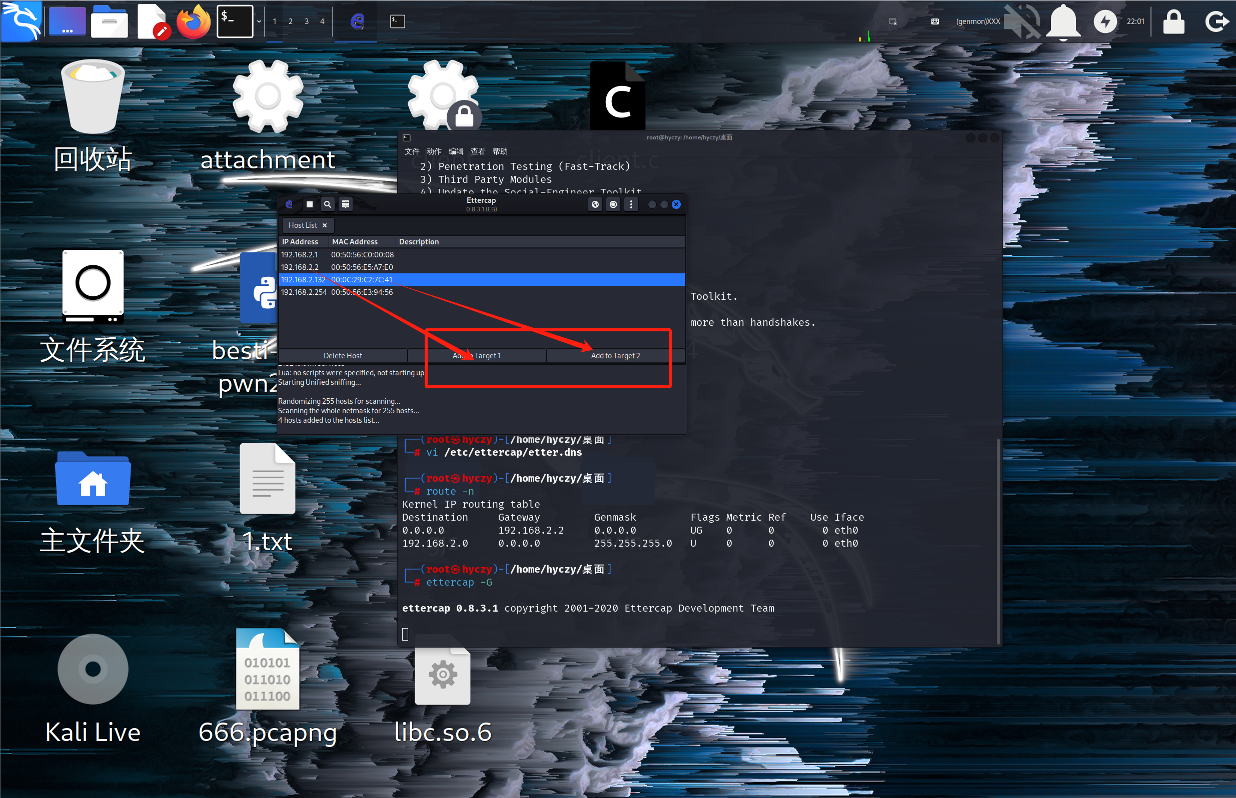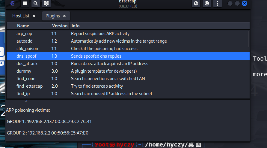 将靶机windows10192.168.2.132加入Target 1,将网关192.168.2.2加入Target 2 点击右上角的地球图标打开MITM,点击ARP poisoning,再点击ok 点击右上角的图标打开Ettercap,选择Plugins中的manage Plugins,双击开启dns_spoof