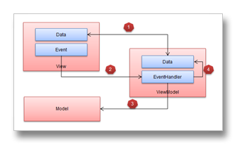 如右图所示,用户行为(比如某个用户点击了页面上的某个Button)触发View的某个事件,与之绑定的定义在ViewModel中的EventHandler(ViewModel的某个方法成员)被自动执行。它可以执行Model,并修改自身维护的数据,由于View和ViewModel的数据绑定是双向的,用户在界面上输入的数据可以被ViewModel捕获,而ViewModel对数据的更新可以自动反映在View上。这样的好出显而易见——我们在通过JS定义UI处理逻辑的时候,无需关注View的细节(View上的HTML),只需要对自身的数据进行操作即可。