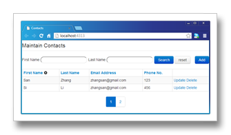 1: public class HomeController : Controller 2: { 3: public const int PageSize = 2; 4: 5: private static List<Contact> contacts = new List<Contact> 6: { 7: new Contact{Id = "001", FirstName = "San", LastName = "Zhang", EmailAddress = "zhangsan@gmail.com", PhoneNo="123"}, 8: new Contact{Id = "002", FirstName = "Si", LastName = "Li", EmailAddress = "zhangsan@gmail.com", PhoneNo="456"}, 9: new Contact{Id = "003", FirstName = "Wu", LastName = "Wang", EmailAddress = "wangwu@gmail.com", PhoneNo="789"} 10: }; 11: 12: public ActionResult Index() 13: { 14: return View(); 15: } 16: 17: public ActionResult GetContacts(string firstName, string lastName, string orderBy, int pageIndex=1, bool isAsc = true) 18: { 19: IEnumerable<Contact> result = from contact in contacts 20: where (string.IsNullOrEmpty(firstName) || contact.FirstName.ToLower().Contains(firstName.ToLower())) 21: && (string.IsNullOrEmpty(lastName) || contact.LastName.ToLower().Contains(lastName.ToLower())) 22: select contact; 23: int count = result.Count(); 24: int totalPages = count / PageSize + (count % PageSize > 0 ? 1 : 0); 25: result = result.Sort(orderBy, isAsc).Skip((pageIndex - 1) * PageSize).Take(PageSize); 26: return Json(new { Data = result.ToArray(), TotalPages = totalPages }, JsonRequestBehavior.AllowGet); 27: } 28: 29: public ActionResult Add() 30: { 31: ViewBag.Action = "Add"; 32: ViewBag.OnSuccess = "viewModel.onDataAdded"; 33: return View("ContactPartial", new Contact { Id = Guid.NewGuid().ToString() }); 34: } 35: 36: [HttpPost] 37: public ActionResult Add(Contact contact) 38: { 39: contacts.Add(contact); 40: return Json(contact); 41: } 42: 43: public ActionResult Update(string id) 44: { 45: ViewBag.Action = "Update"; 46: ViewBag.OnSuccess = "viewModel.onDataUpdated"; 47: return View("ContactPartial", contacts.First(c=>c.Id == id)); 48: } 49: 50: [HttpPost] 51: public ActionResult Update(Contact contact) 52: { 53: Contact existing = contacts.First(c=>c.Id == contact.Id); 54: existing.FirstName = contact.FirstName; 55: existing.LastName = contact.LastName; 56: existing.PhoneNo = contact.PhoneNo; 57: existing.EmailAddress = contact.EmailAddress; 58: return Json(contact); 59: } 60: 61: public ActionResult Delete(string id) 62: { 63: Contact existing = contacts.First(c=>c.Id == id); 64: contacts.Remove(existing); 65: return Json(existing,JsonRequestBehavior.AllowGet); 66: } 67: }