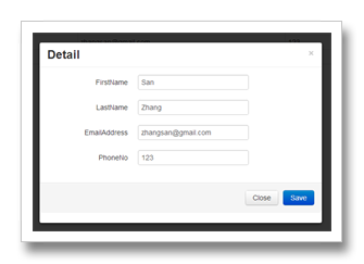 1: @model Contact 2: @{ 3: Layout = null; 4: } 5: @using (Ajax.BeginForm((string)ViewBag.Action , "Home", null, new AjaxOptions { HttpMethod = "Post", OnSuccess = (string)ViewBag.OnSuccess }, new { @class = "form-horizontal" })) 6: { 7: <div class="modal-header"> 8: <button type="button" class="close" data-dismiss="modal" aria-hidden="true">×</button> 9: <h3>Detail</h3> 10: </div> 11: <div class="modal-body"> 12: <div class="control-group"> 13: @Html.HiddenFor(model=>model.Id) 14: @Html.LabelFor(model=>model.FirstName,new{@class="control-label"}) 15: <div class="controls"> 16: @Html.EditorFor(model => model.FirstName) 17: @Html.ValidationMessageFor(model => model.FirstName) 18: </div> 19: </div> 20: 21: <div class="control-group"> 22: @Html.LabelFor(model=>model.LastName,new{@class="control-label"}) 23: <div class="controls"> 24: @Html.EditorFor(model => model.LastName) 25: @Html.ValidationMessageFor(model => model.LastName) 26: </div> 27: </div> 28: 29: <div class="control-group"> 30: @Html.LabelFor(model=>model.EmailAddress,new{@class="control-label"}) 31: <div class="controls"> 32: @Html.EditorFor(model => model.EmailAddress) 33: @Html.ValidationMessageFor(model => model.EmailAddress) 34: </div> 35: </div> 36: 37: <div class="control-group"> 38: @Html.LabelFor(model=>model.PhoneNo,new{@class="control-label"}) 39: <div class="controls"> 40: @Html.EditorFor(model => model.PhoneNo) 41: @Html.ValidationMessageFor(model => model.PhoneNo) 42: </div> 43: </div> 44: </div> 45: 46: <div class="modal-footer"> 47: <a href="#" class="btn" data-dismiss="modal">Close</a> 48: <input type="submit" class="btn btn-primary" value="Save" /> 49: </div> 50: }